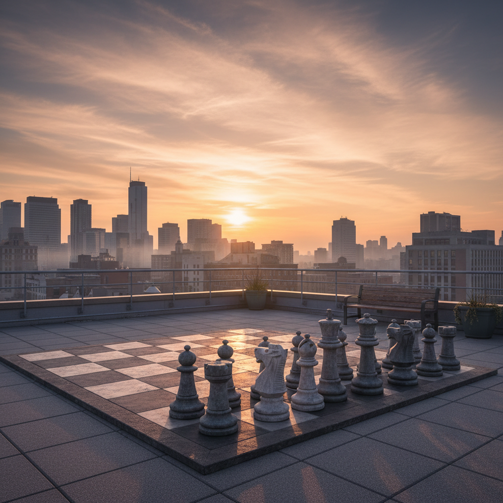 Alt text: Chessboard on a rooftop at sunrise, symbolizing new beginnings in accommodation competition.