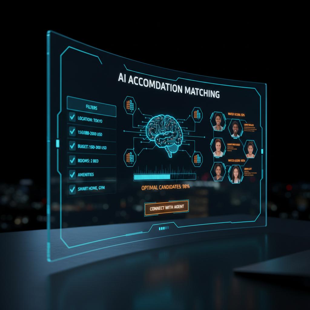 Alt: AI-driven platform matching travelers to perfect stays using futuristic tech interface.
