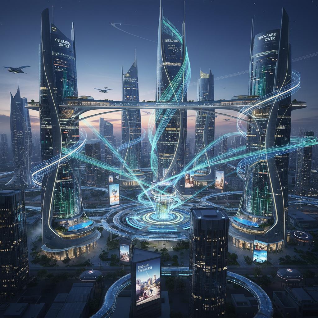 Alt text: AI-driven personalization in the future of accommodation packages, with a futuristic cityscape and data streams linking hotels.