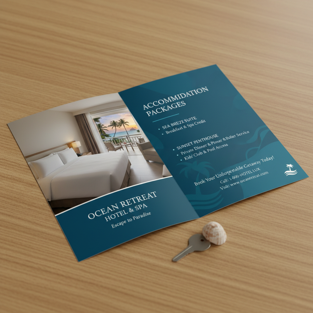 Alt text: A split hotel brochure representing the dual nature of accommodation packages, symbolizing both the allure and hidden pitfalls of bundled travel deals.