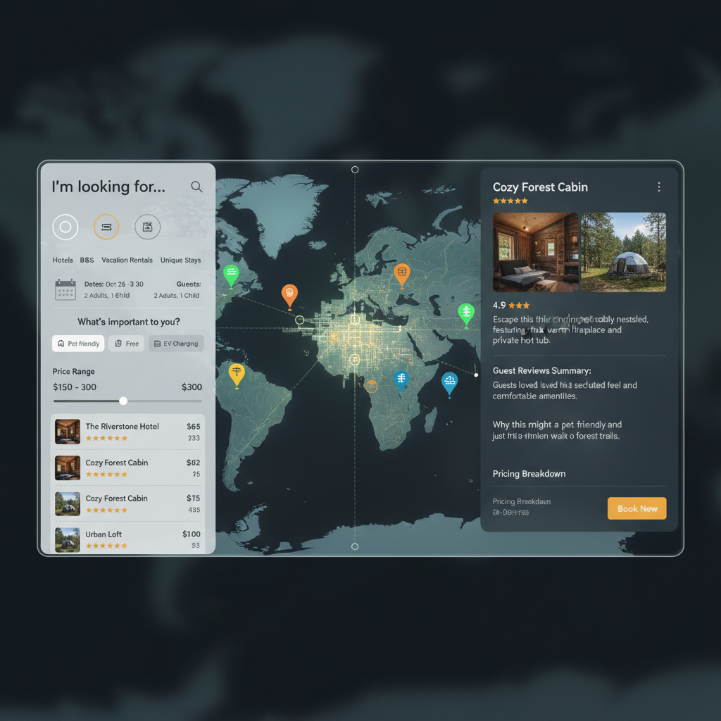 Alt text: Sleek AI-powered interface suggesting local accommodations, AI accommodation finder, human insight meets technology.
