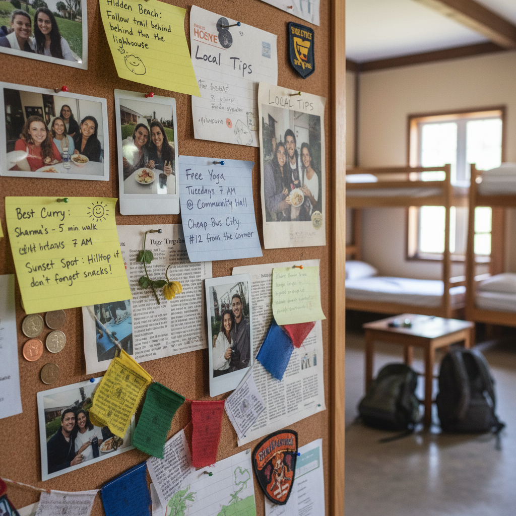 Alt text: Collection of handwritten local accommodation tips at a hostel pinned to a community wall, local accommodation secrets, insider tips.