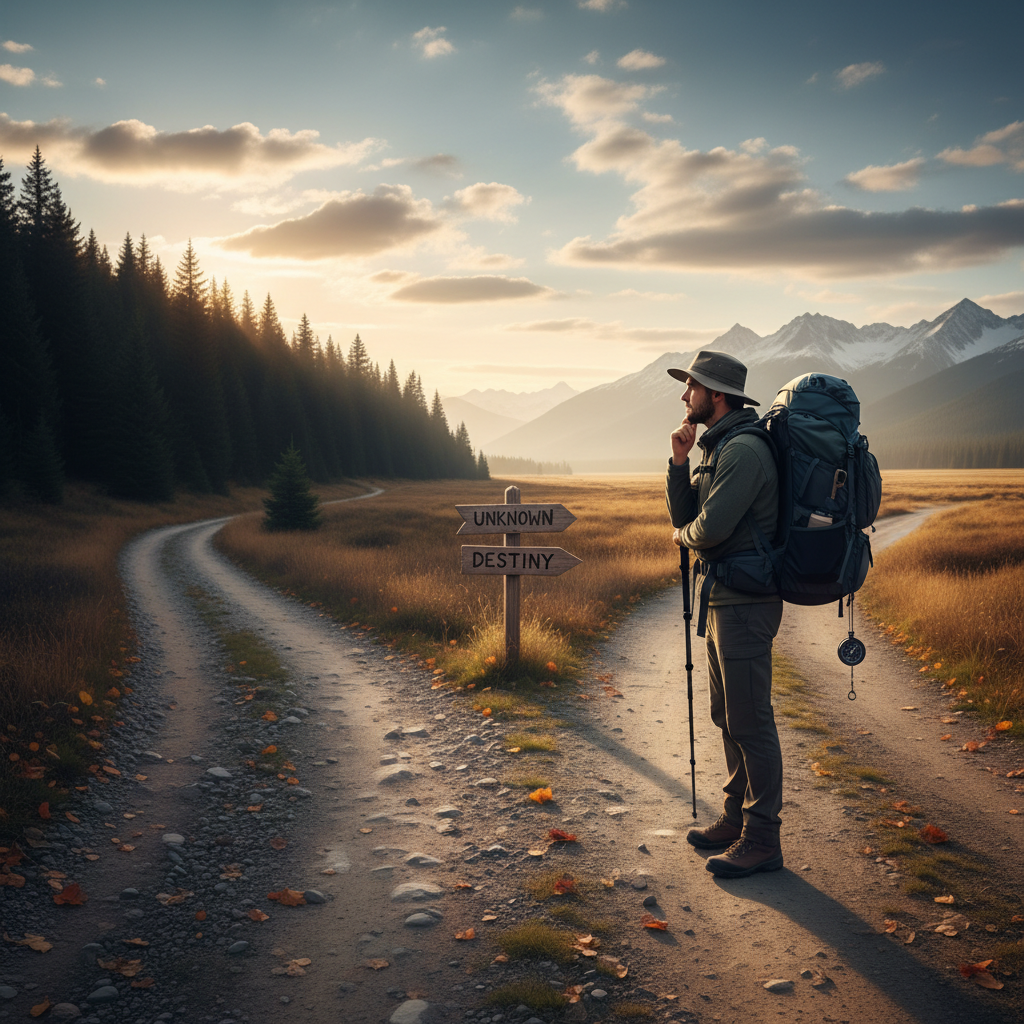 Alt text: Traveler choosing between different paths at sunset, symbolizing decision-making in accommodation choices, authentic travel tips.