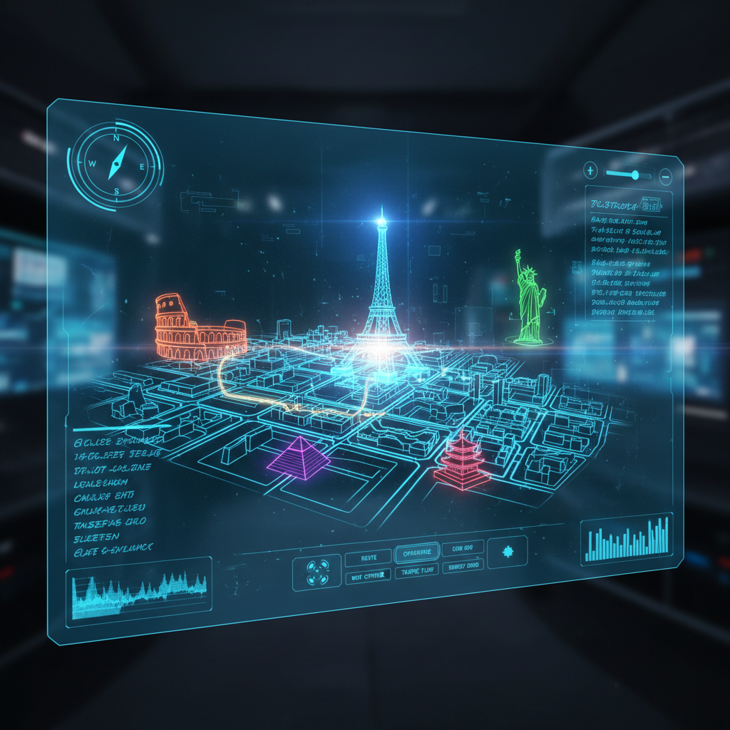 Futuristic UI showing real-time accommodation distance mapping, revolutionizing how proximity is measured.