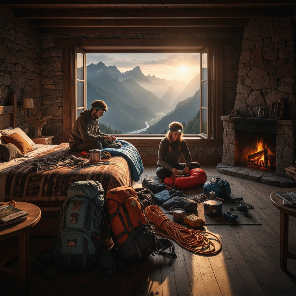 Backpackers at a remote adventure hotel unpacking their gear—rugged realities often missed by standard booking platforms.