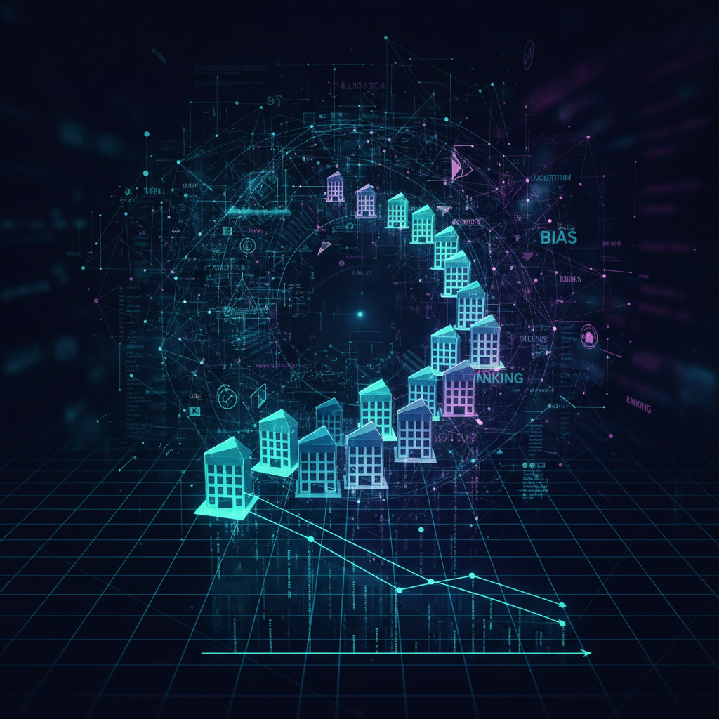Alt: Abstract photo of hotels being ranked by invisible algorithms, referencing bias and keyword “alternatives to hotel comparison sites”