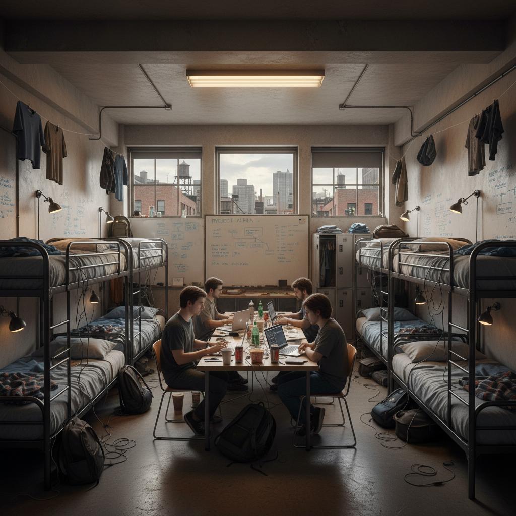 A large room with multiple beds, usually owned or contracted by the bootcamp. Shared bathrooms, communal kitchens, and strict rules are standard.