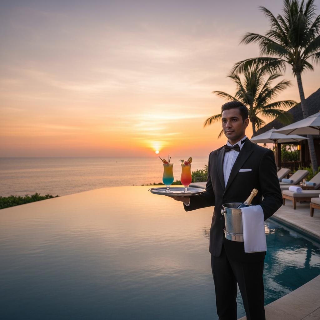 Alt text: Butler providing discreet poolside service to hotel guest at sunset, highlighting privacy and attentive hospitality.