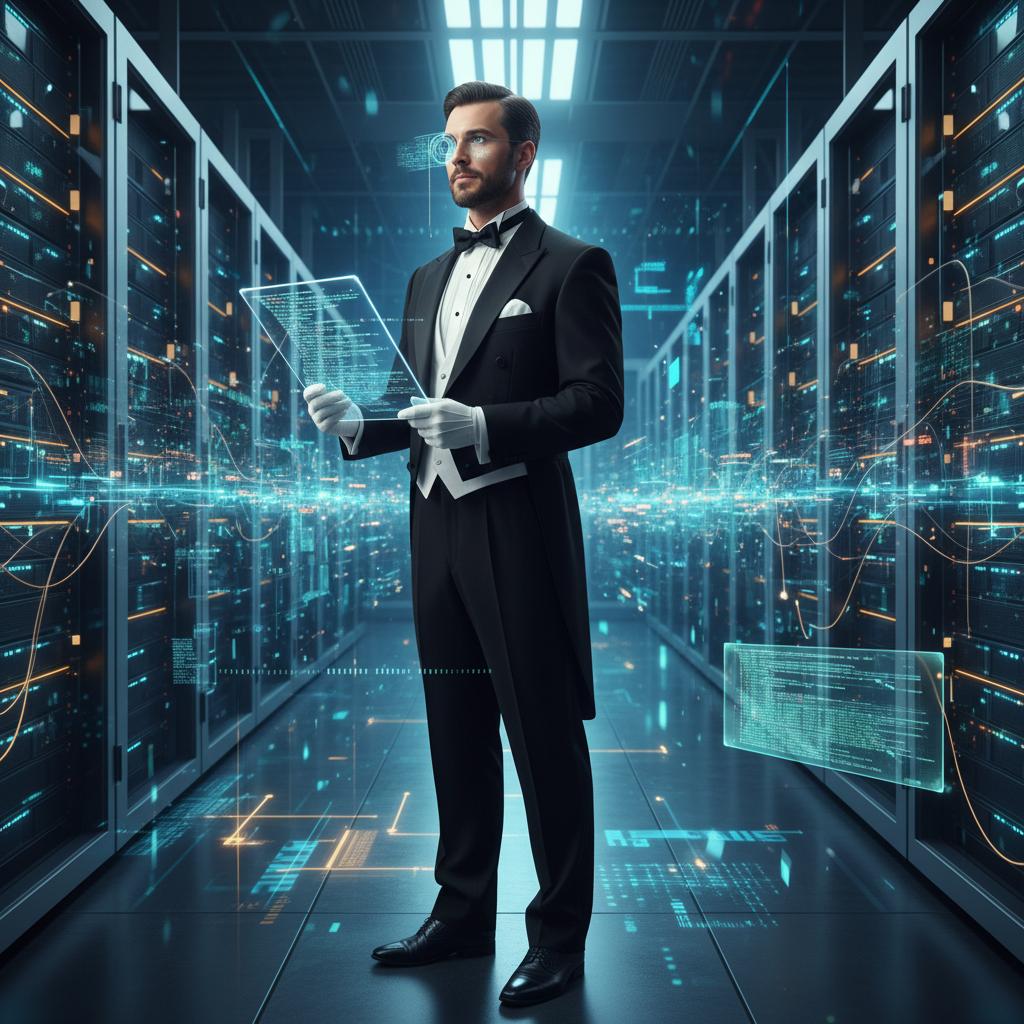 Alt text: Symbolic image of a classic butler dissolving into digital code, representing the future of butler service and AI disruption.
