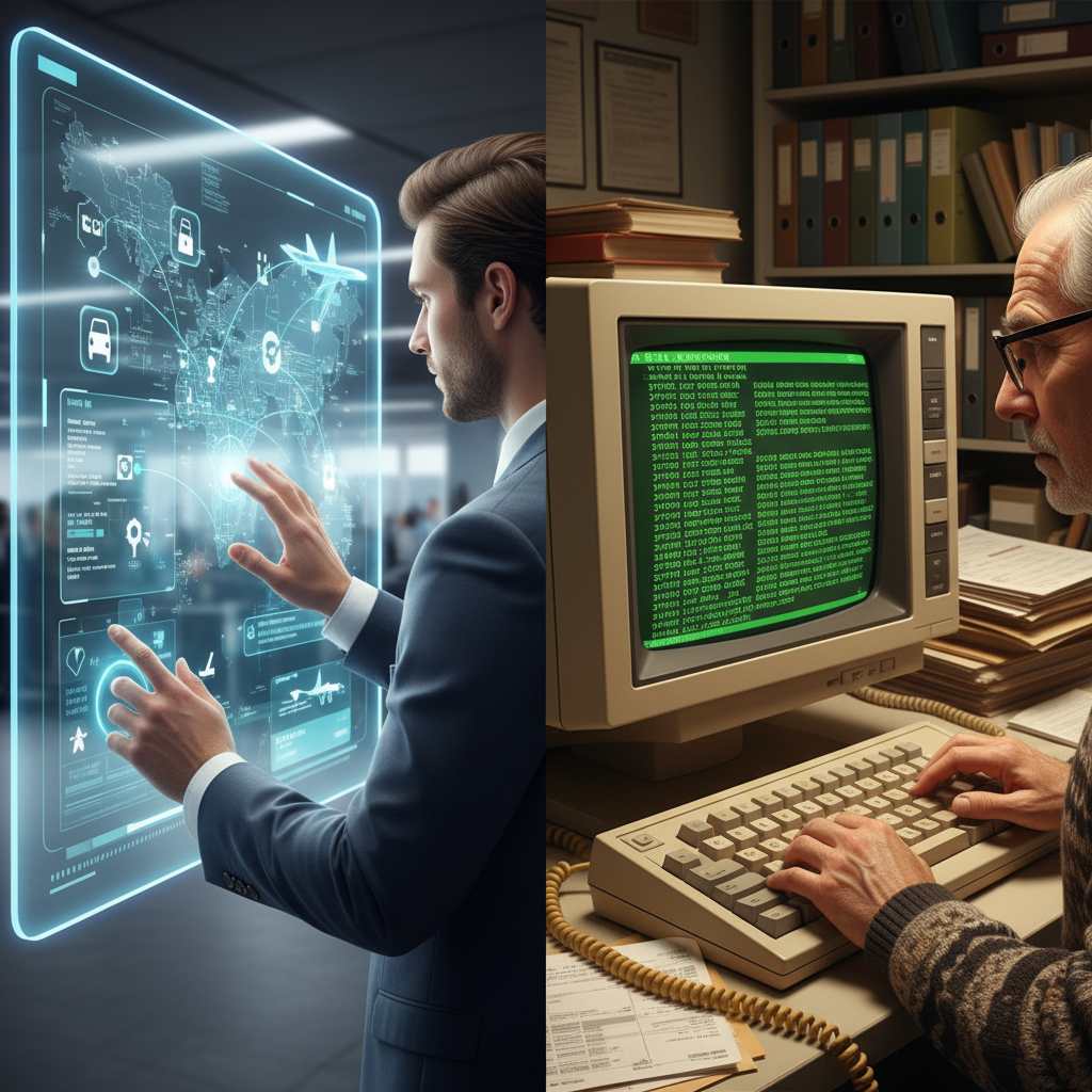 Alt text: Digital layers and legacy systems in corporate travel booking, with overlapping interfaces and old-school terminals.
