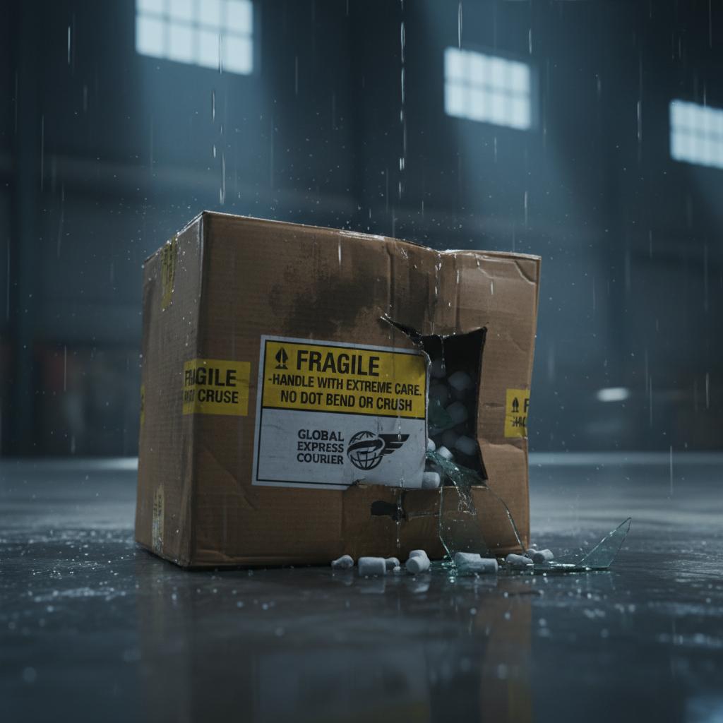 Alt text: Damaged package with visible warning label, soft dramatic lighting, courier service risk.