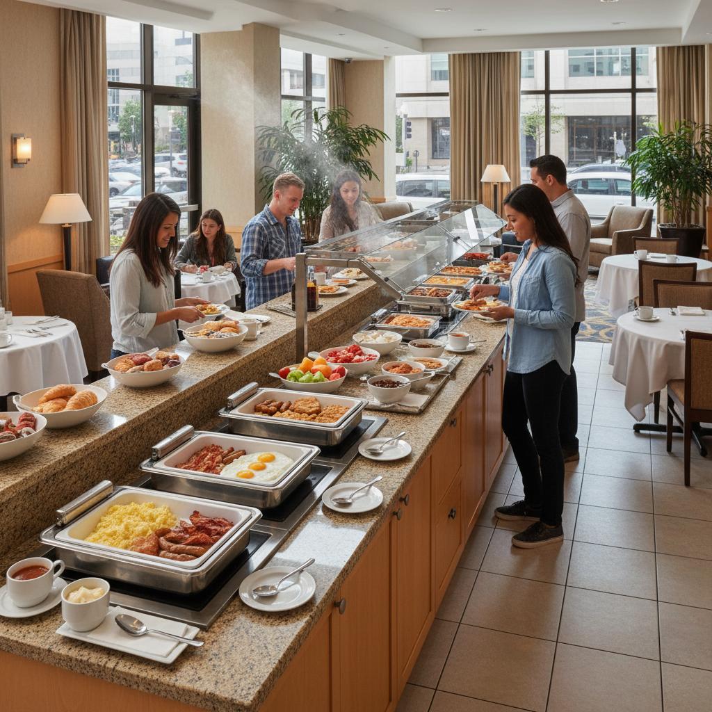 Alt: Guests enjoying breakfast buffet at Embassy Suites.