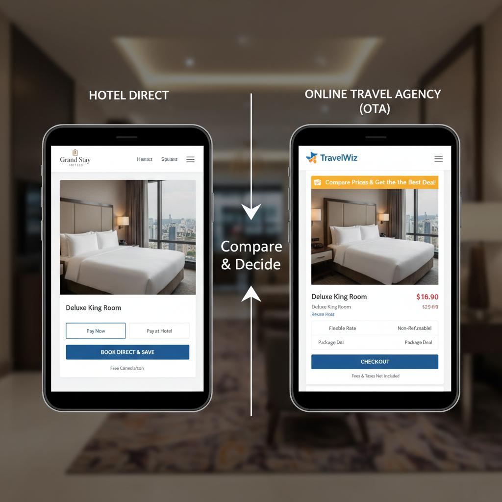 Comparing check out options on hotel and OTA booking sites, modern and clear.