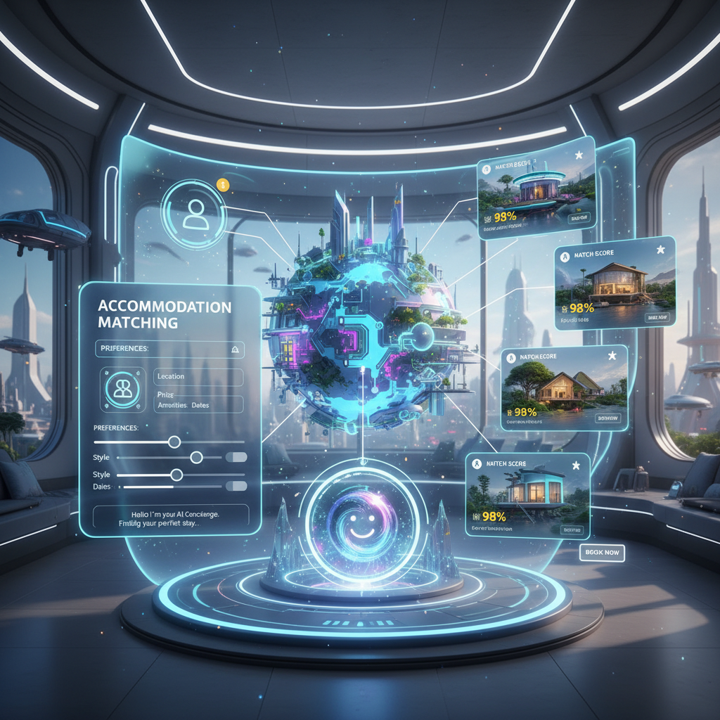 Futuristic interface visualizing AI matching unique stays to user preferences.