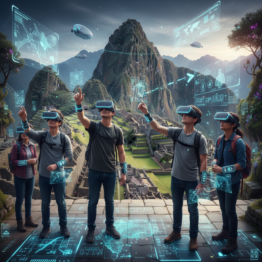 Photo of a speculative future group travel scene with augmented reality overlays, representing digital integration and the evolving nature of group packages.