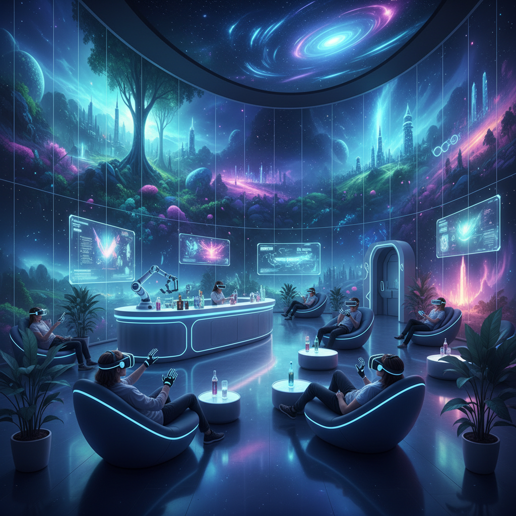 Futuristic hostel concept with digital interfaces and diverse travelers—alt text: Futuristic hostel interior with virtual reality integration.