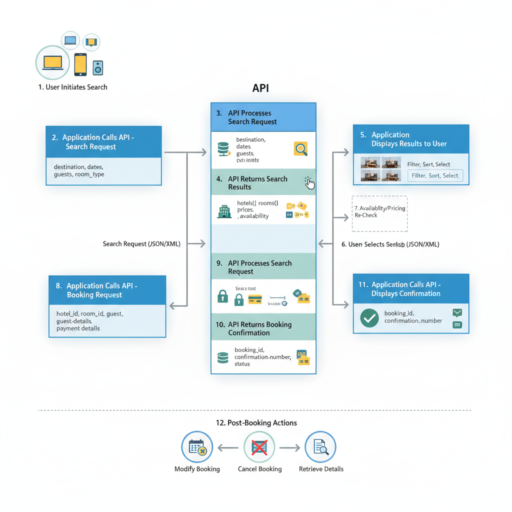 - Booking: User enters details. API call creates the reservation in the hotel’s system.