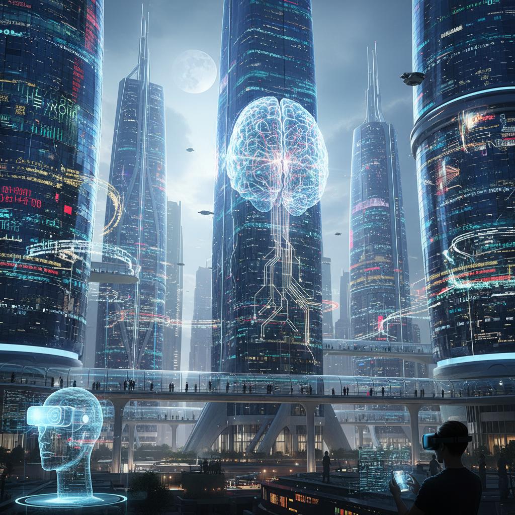 Alt text: Futuristic scene of a traveler using voice command to book a hotel in a sleek, minimal living room.