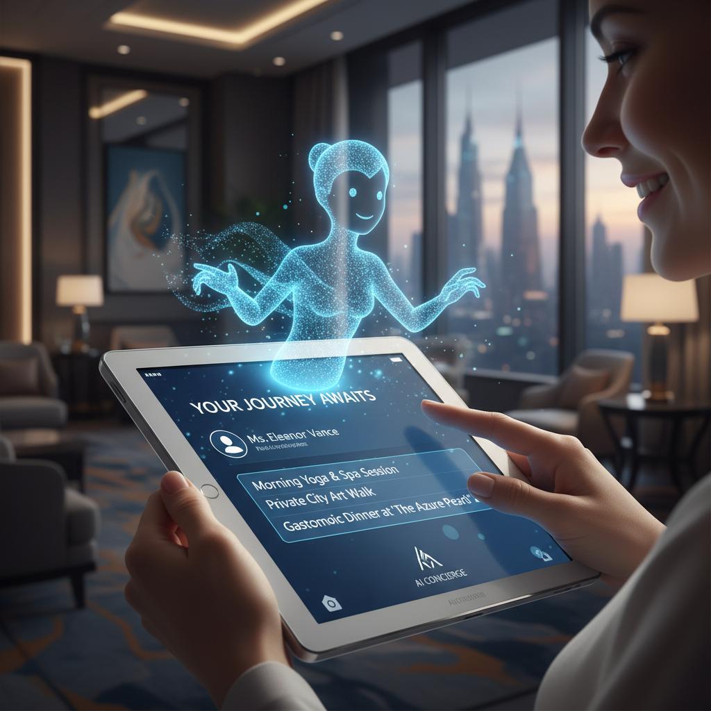 Alt text: Robot hotel concierge holding a digital tablet suggesting tailored hotel stays using AI technology.