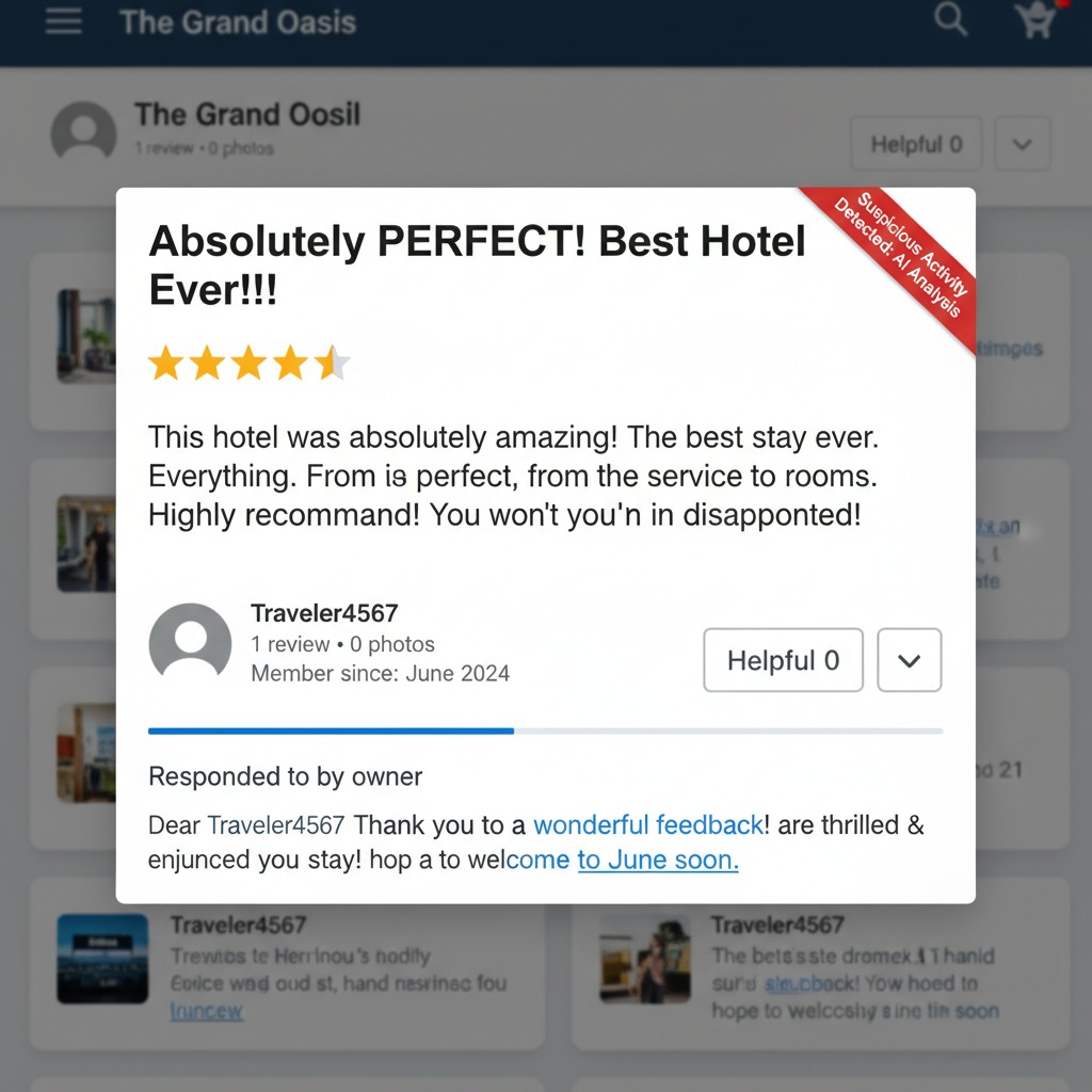 - Reviewer history: Profiles with no other reviews or suspiciously similar writing styles are suspect.