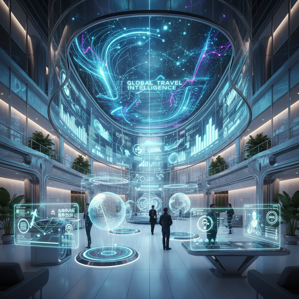 Alt text: Edgy hotel lobby scene with a traveler surrounded by digital data, hotel booking with advanced analysis theme.