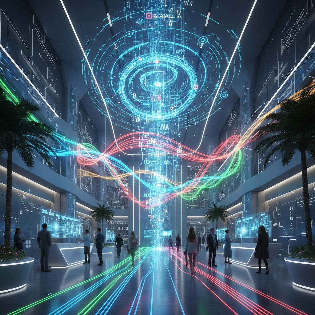 Alt text: Vision of a futuristic hotel lobby with holographic booking interfaces and AI-driven accommodation finders