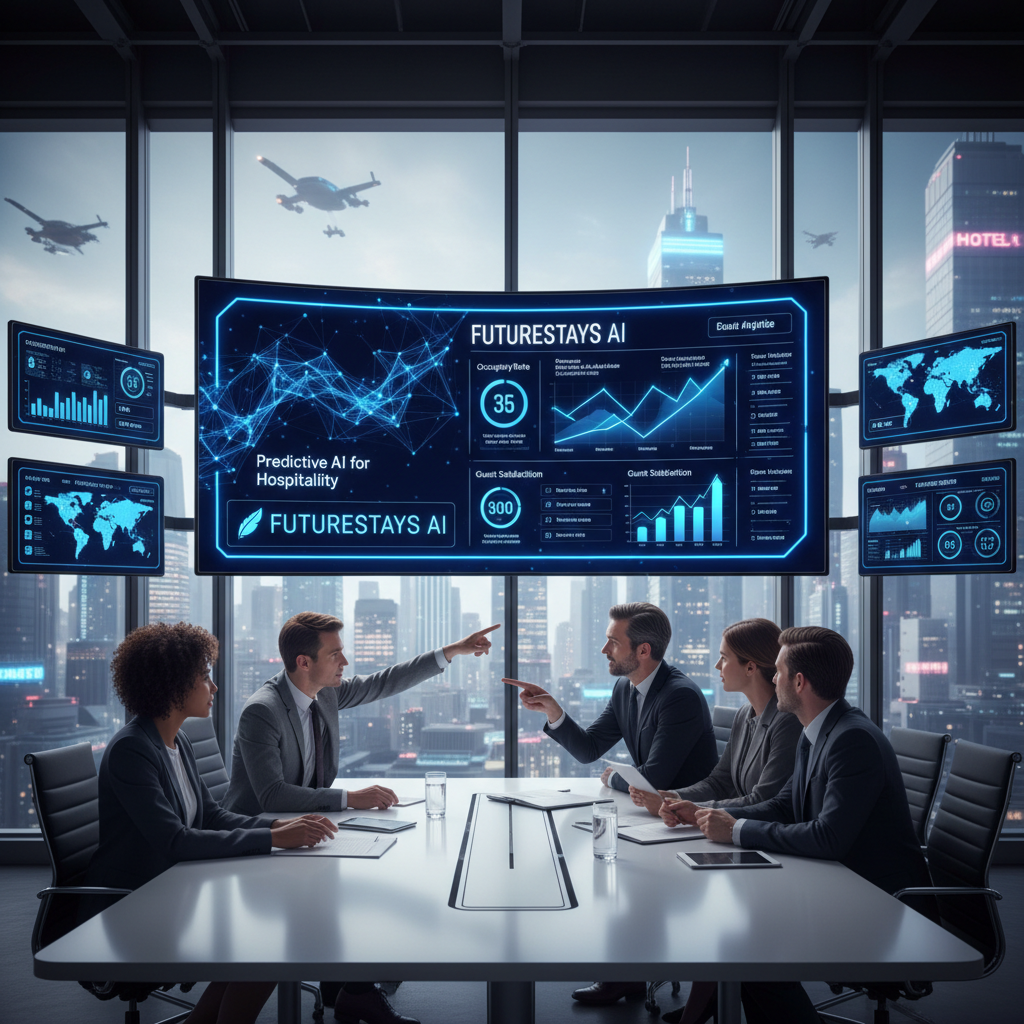 Image: Data analyst examining futurestays.ai dashboard for hotel occupancy analytics in a modern office.