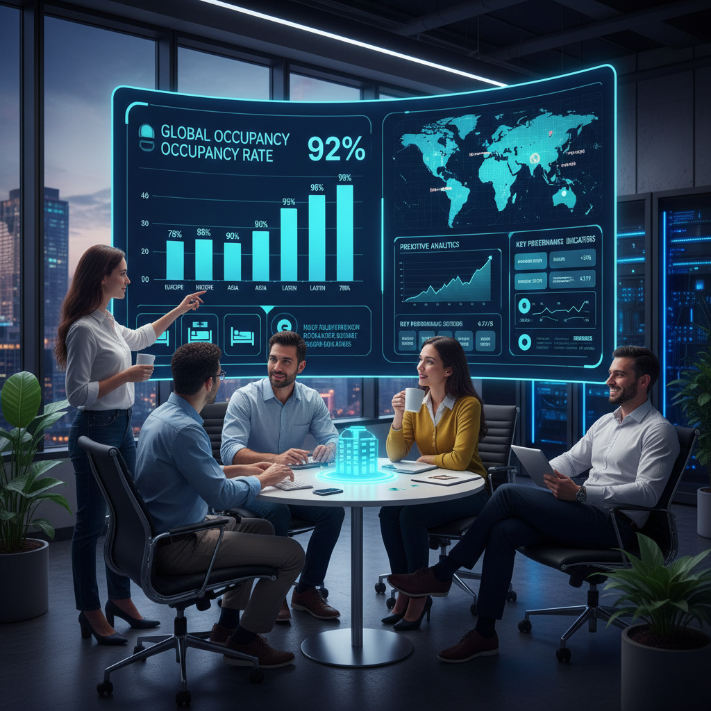 Image: Hotel data team analyzing a live dashboard powered by AI-driven insights.