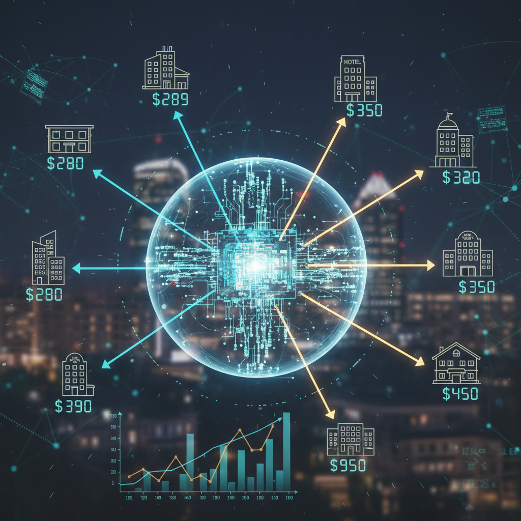 Alt text: Data streams and algorithms visualized for hotel pricing on glowing screens in a moody office