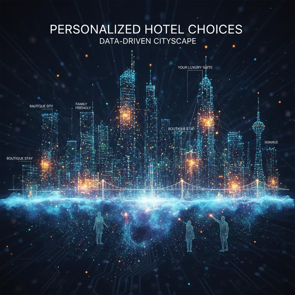 Abstract visualization showing data points forming a city skyline, symbolizing the power of big data in hotel recommendations. Alt: Data-driven cityscape representing personalized hotel choices, hotel recommendations better than concierge
