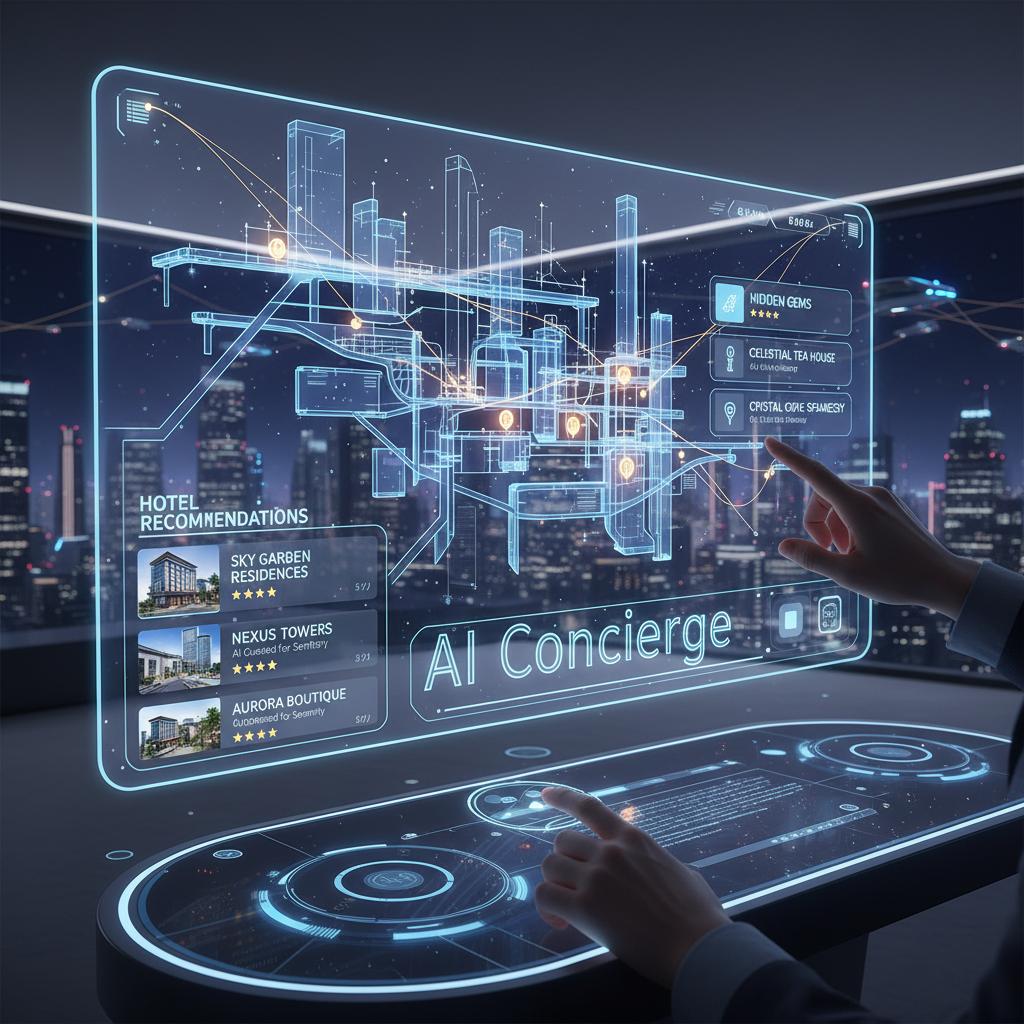 Visualizing a futuristic interface overlaying a city map, pinpointing hidden gems and unique hotel options. Alt: AI-driven hotel recommendation system with interactive map, hotel recommendations better than concierge