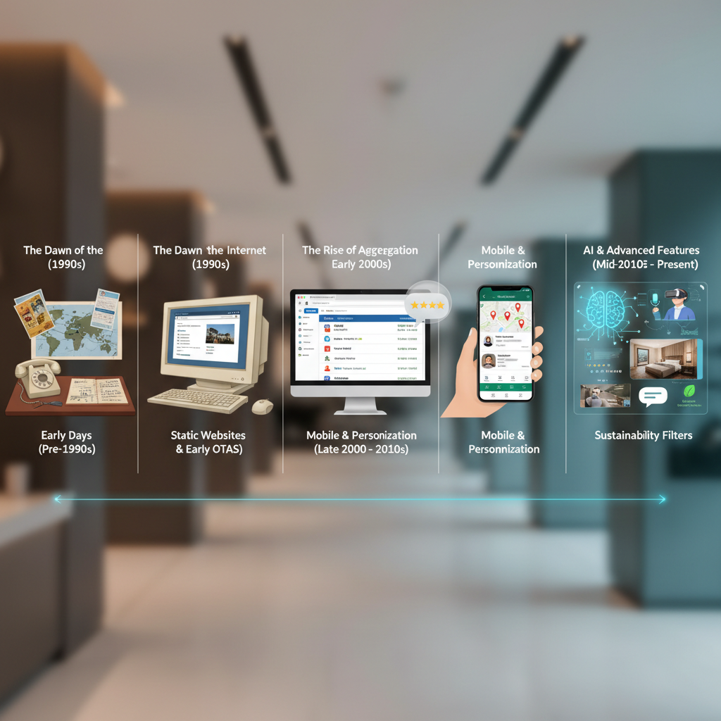Image: A collage of historic and modern hotel search tools, visually representing the journey from manual to AI-powered methods.