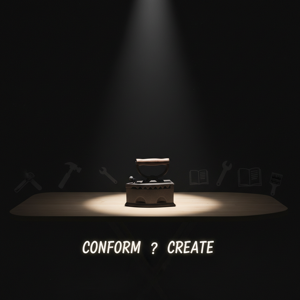Editorial photo of an iron on an empty board, spotlighted, symbolizing the crossroads of choice in domestic labor