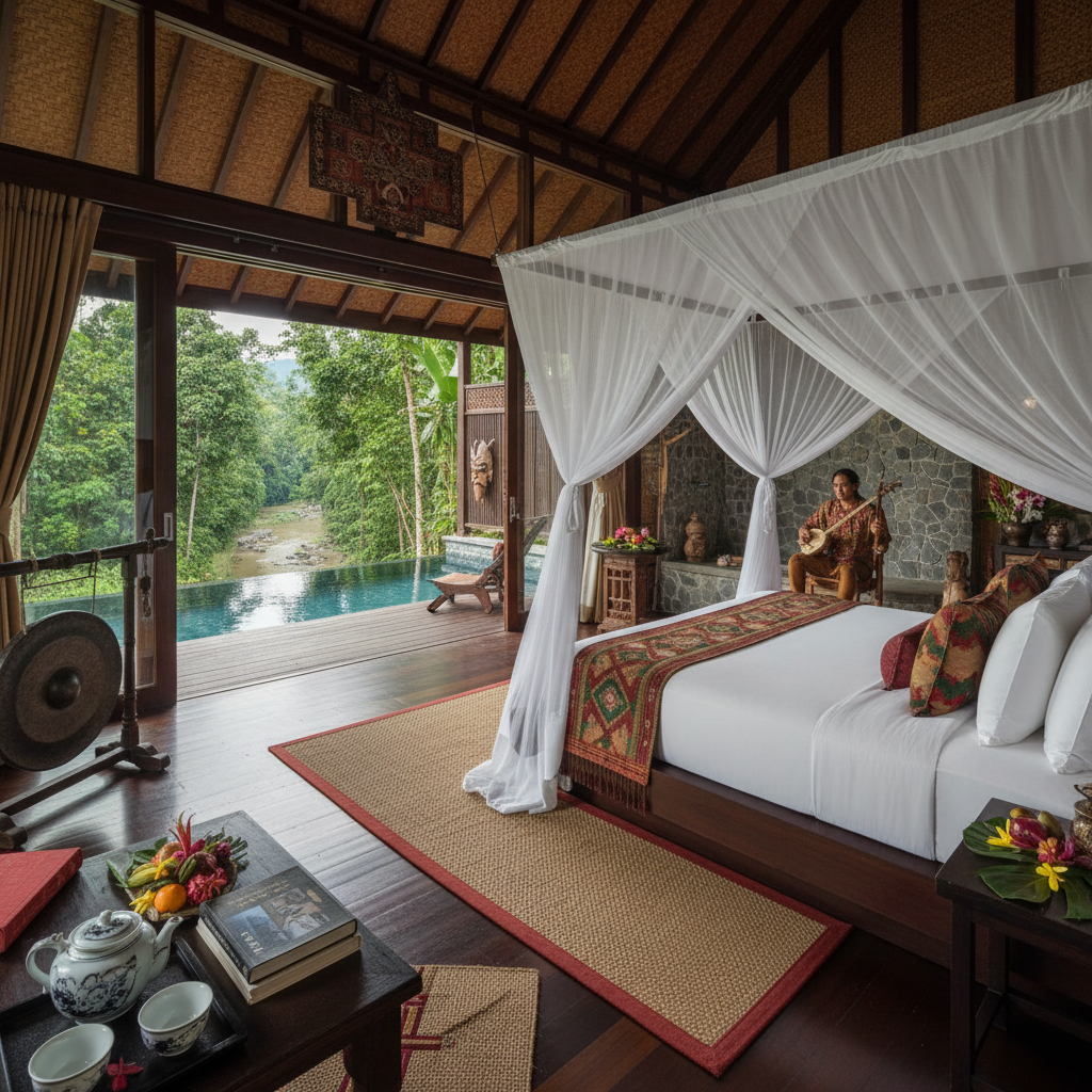 Alt text: Traveler experiencing cultural immersion in luxury accommodation with local hosts.