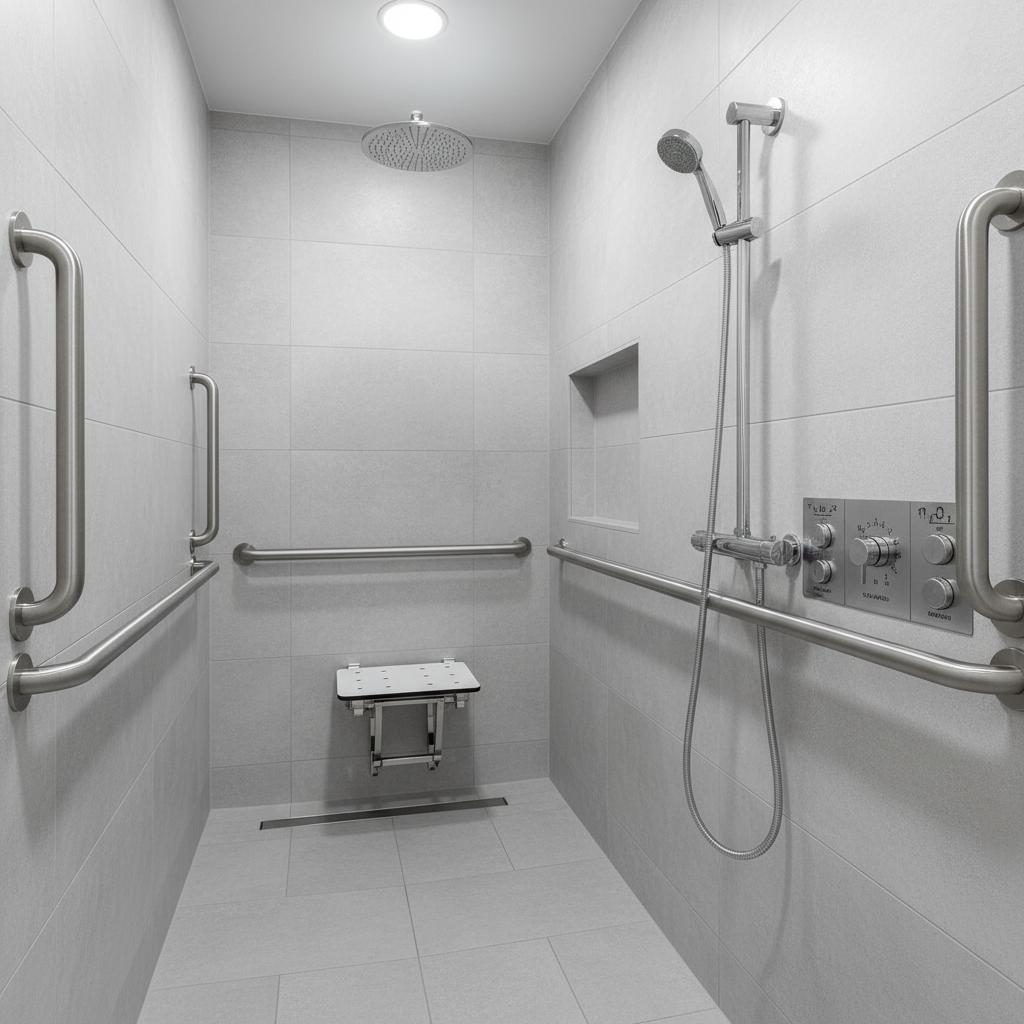A doorway under 80cm is a nonstarter for many users; bed heights above 60cm make safe transfers difficult. According to Access Board standards, roll-in showers should have a threshold no higher than 1.3cm, and grab bars must support at least 113kg.