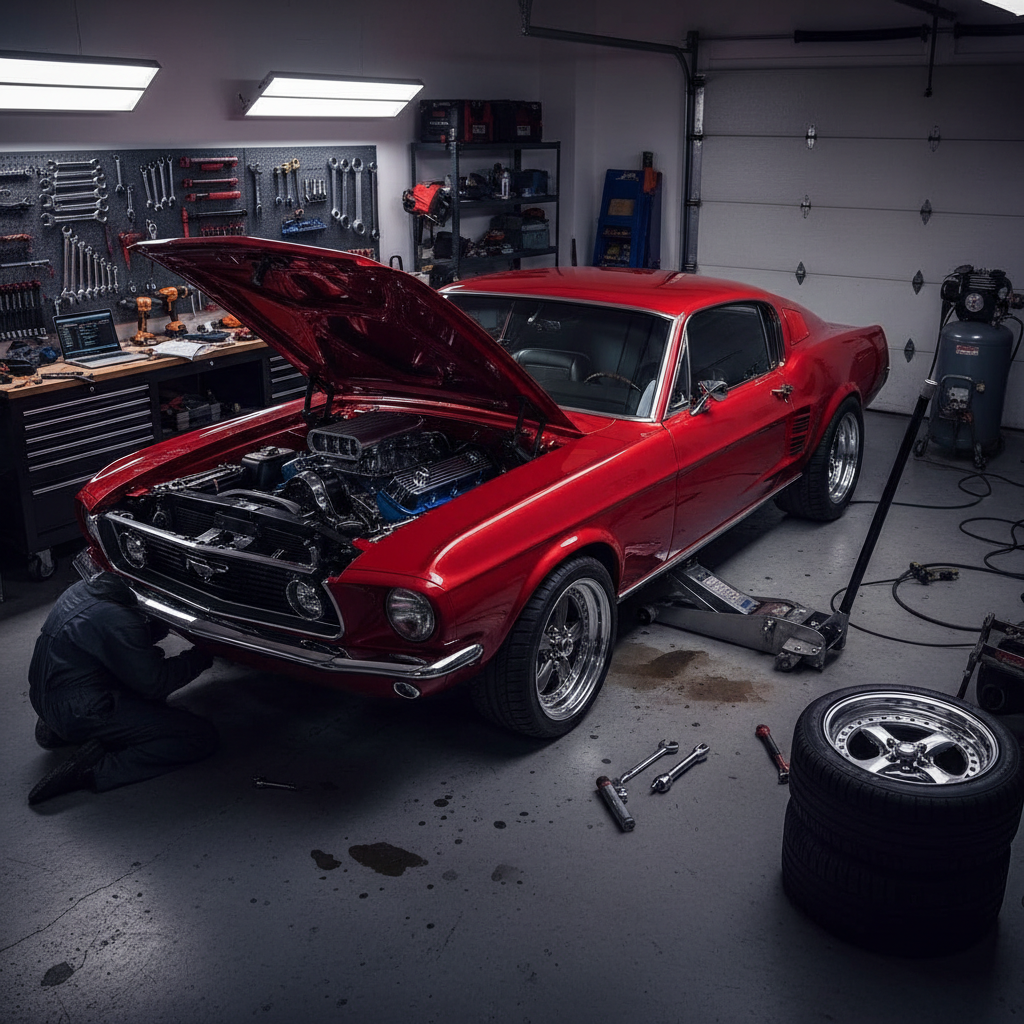 Alt text: Car halfway through modification in garage, tools and equipment scattered, demonstrating vehicle customization process