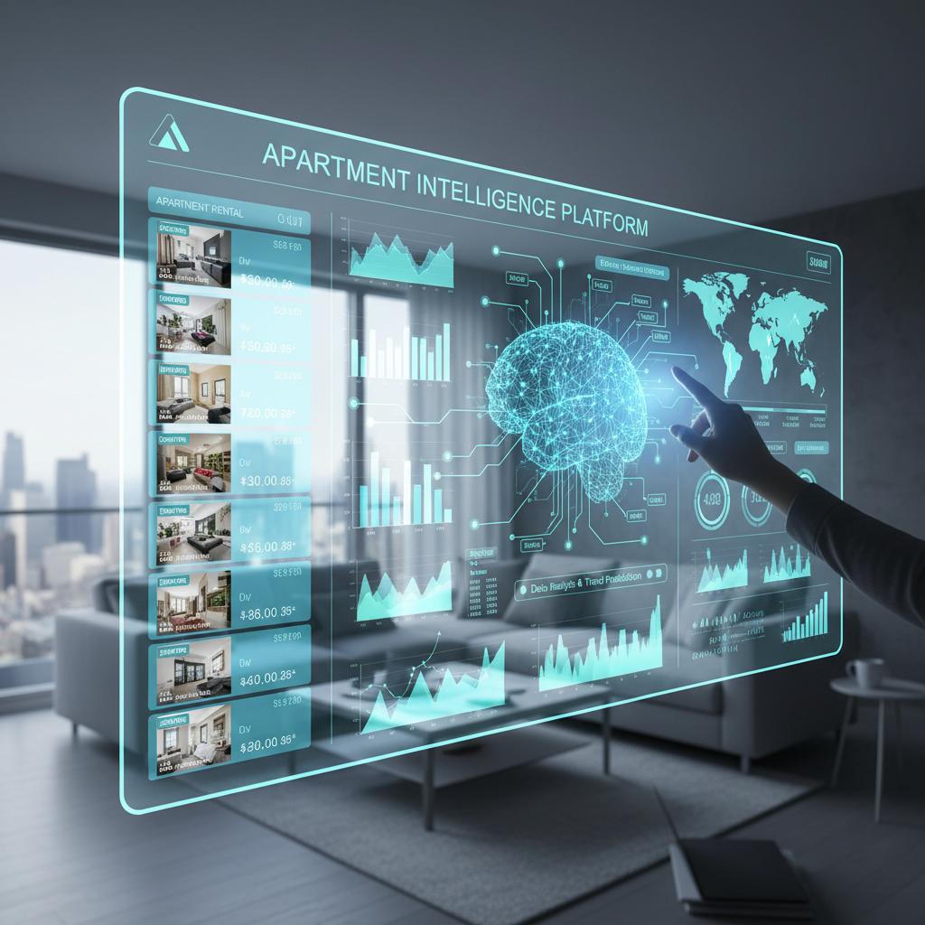 Alt text: Futuristic cityscape with digital overlays of rental data and apartment locations, illustrating the evolving landscape of monthly rentals.