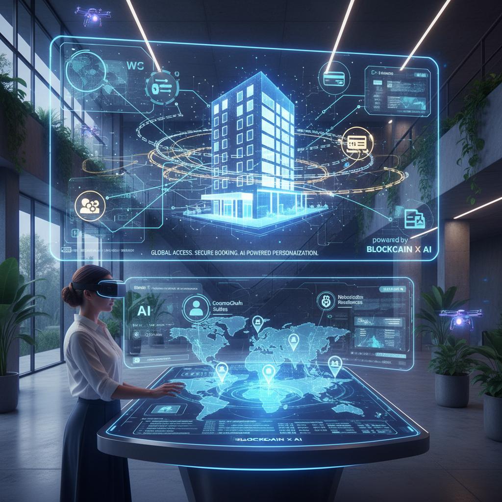 Futuristic visual of interconnected hotel and traveler icons via blockchain, representing AI and blockchain in online hotel reservations
