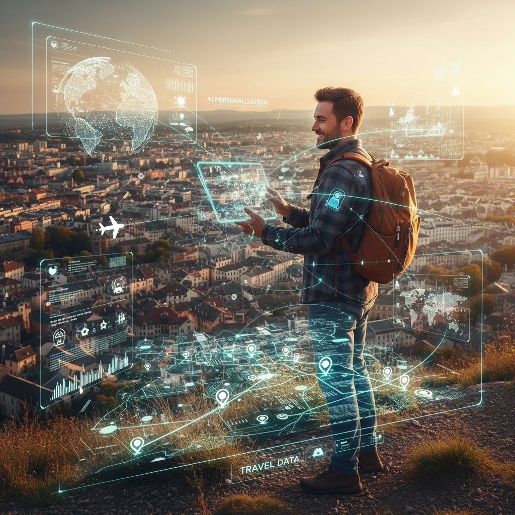 Alt text: Futuristic photo visualizing data streams and digital avatars customizing a traveler's journey with AI