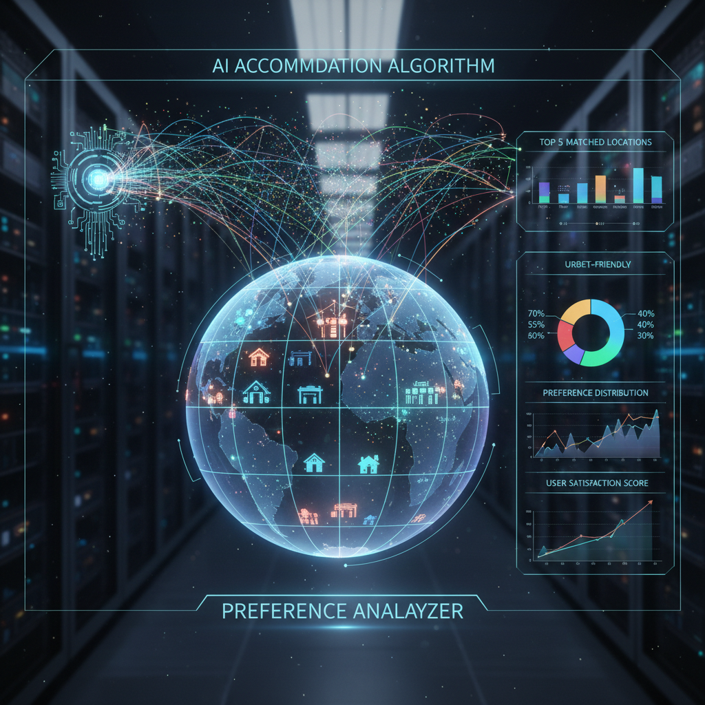 Stylized graphic: AI algorithm visualizing user preferences. Alt text: 'AI algorithm mapping accommodation preferences.'