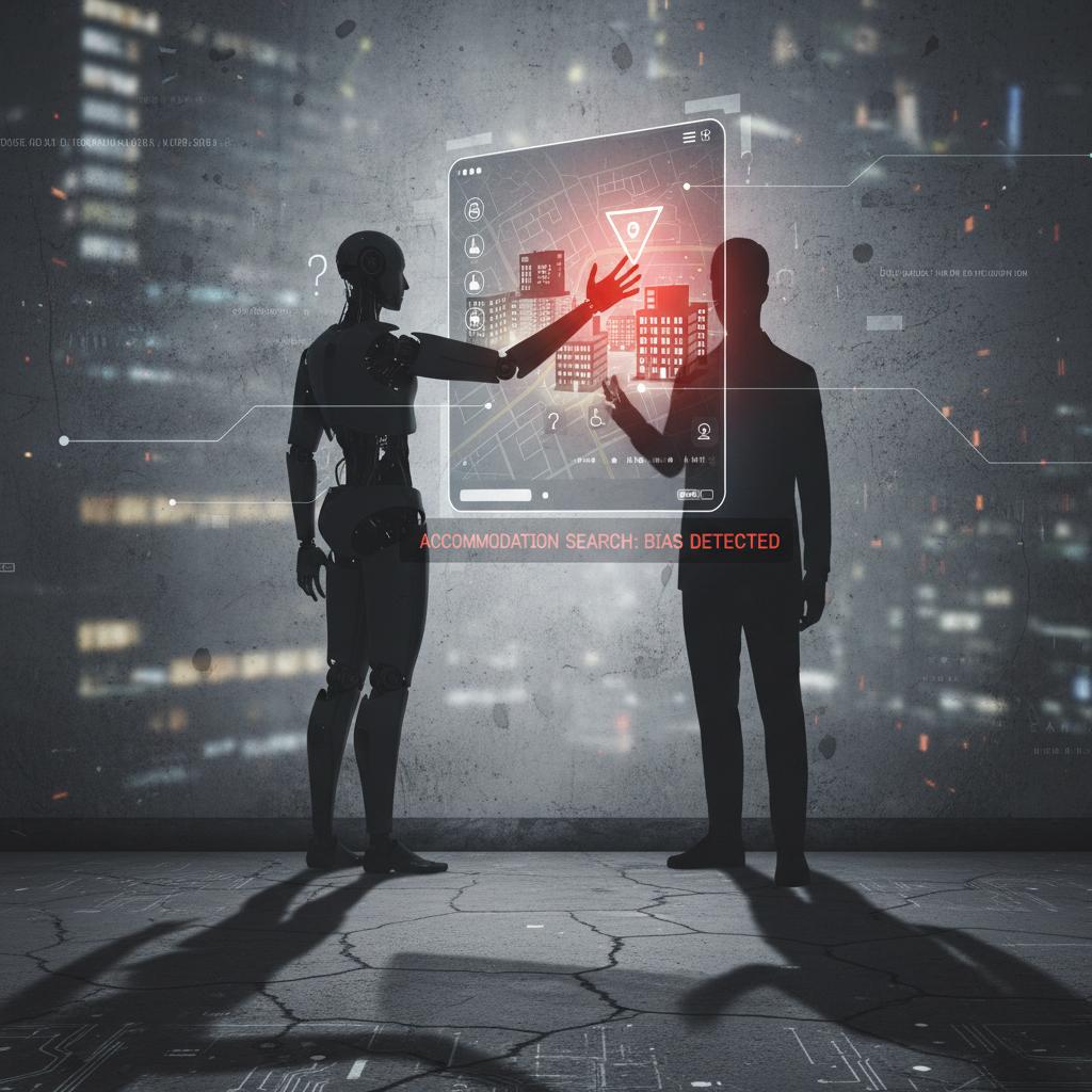 Conceptual graphic: robot with a shadowy human figure behind. Alt text: 'Illustration of AI bias in accommodation search.'