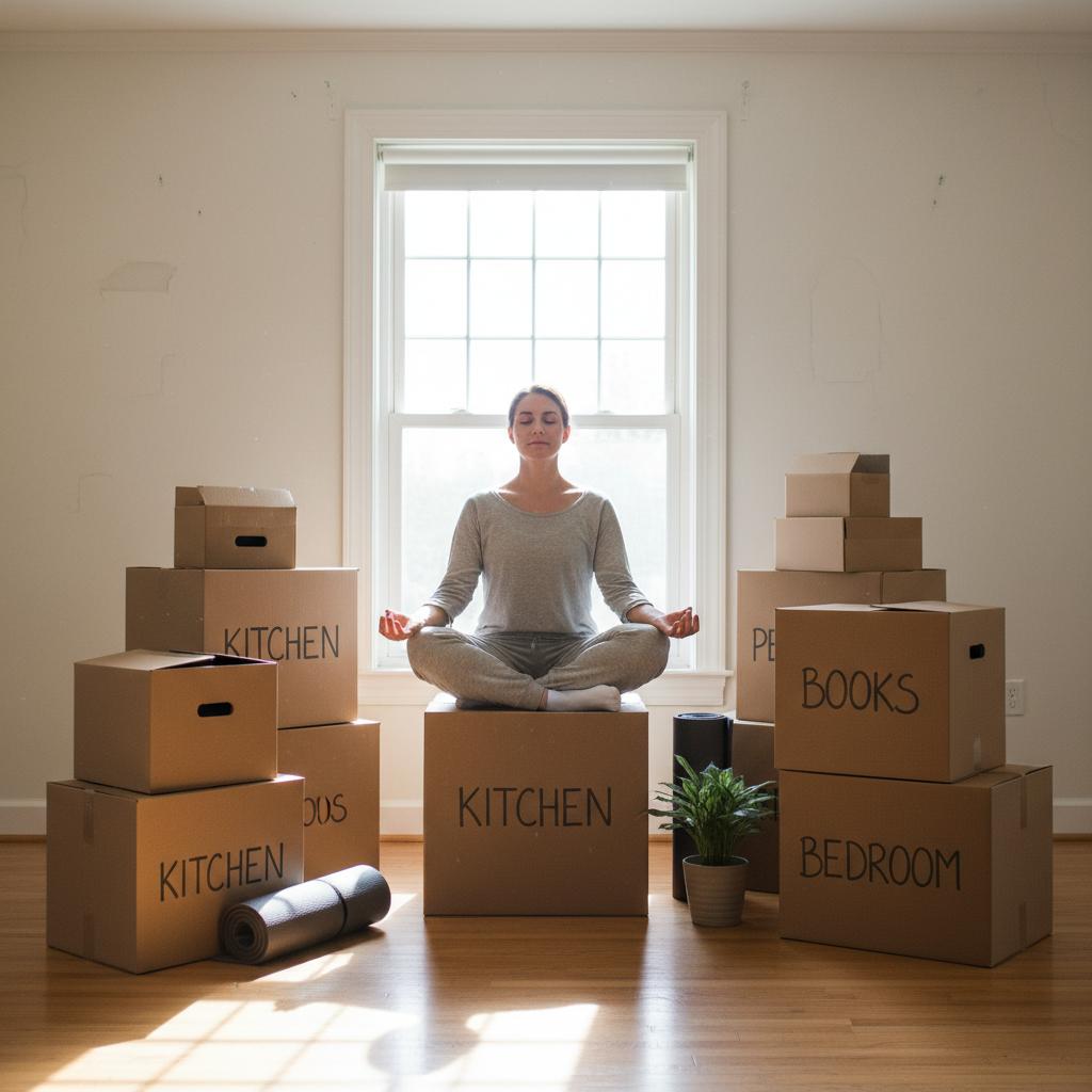 Edgy, candid photo: someone meditating amidst moving boxes. Alt text: 'Relocating person meditating during move.'