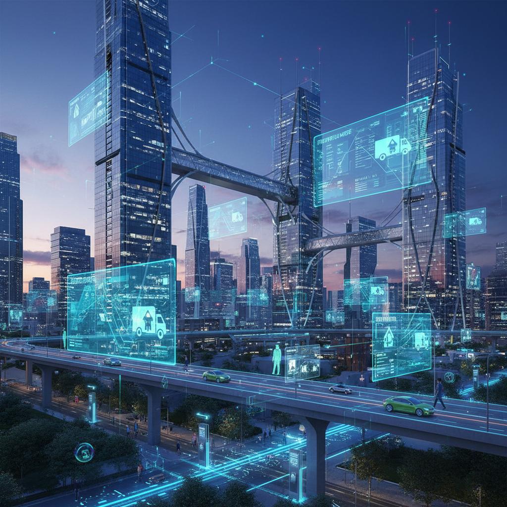 Futuristic cityscape: digital overlays represent the future of relocation tech. Alt text: 'Smart city representing future of relocation tech.'