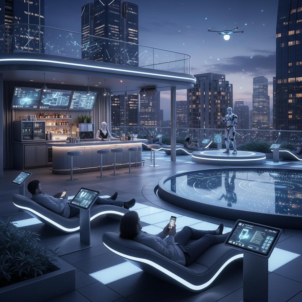 Futuristic rooftop hotel lounge with smart technology and immersive lighting.