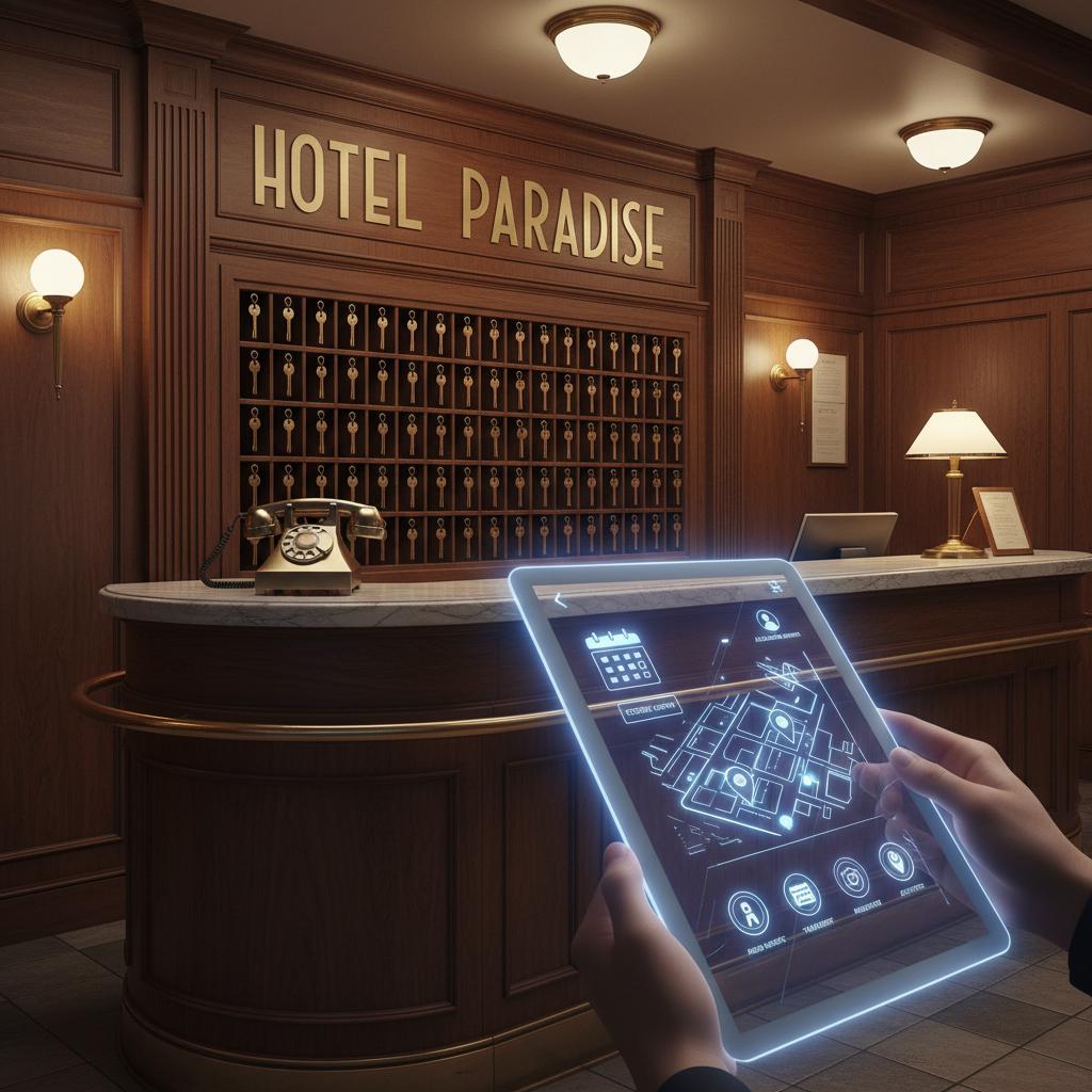 Alt text: Evolution of hotel booking, from old-school reception to modern booking app interface with third party booking keyword