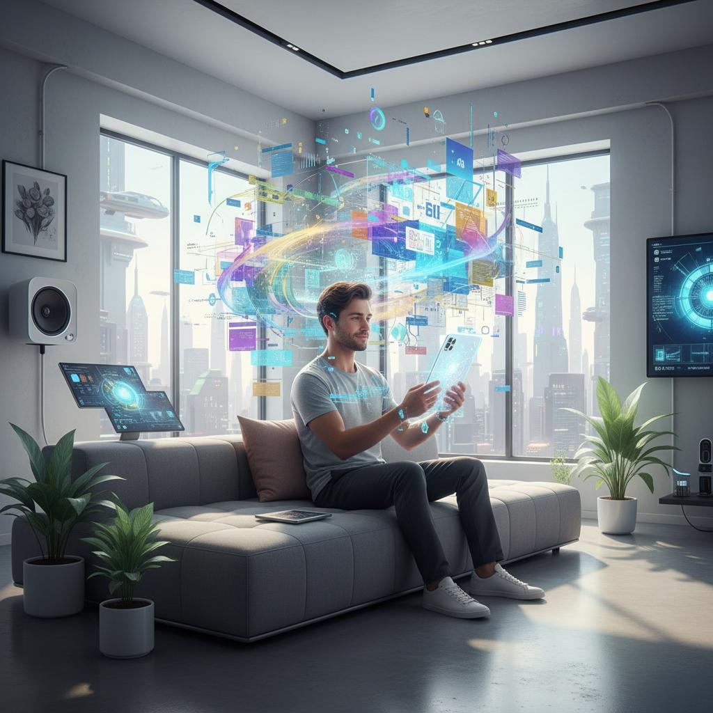 Alt: Person using AI accommodation finder app for vacation packages in a modern apartment