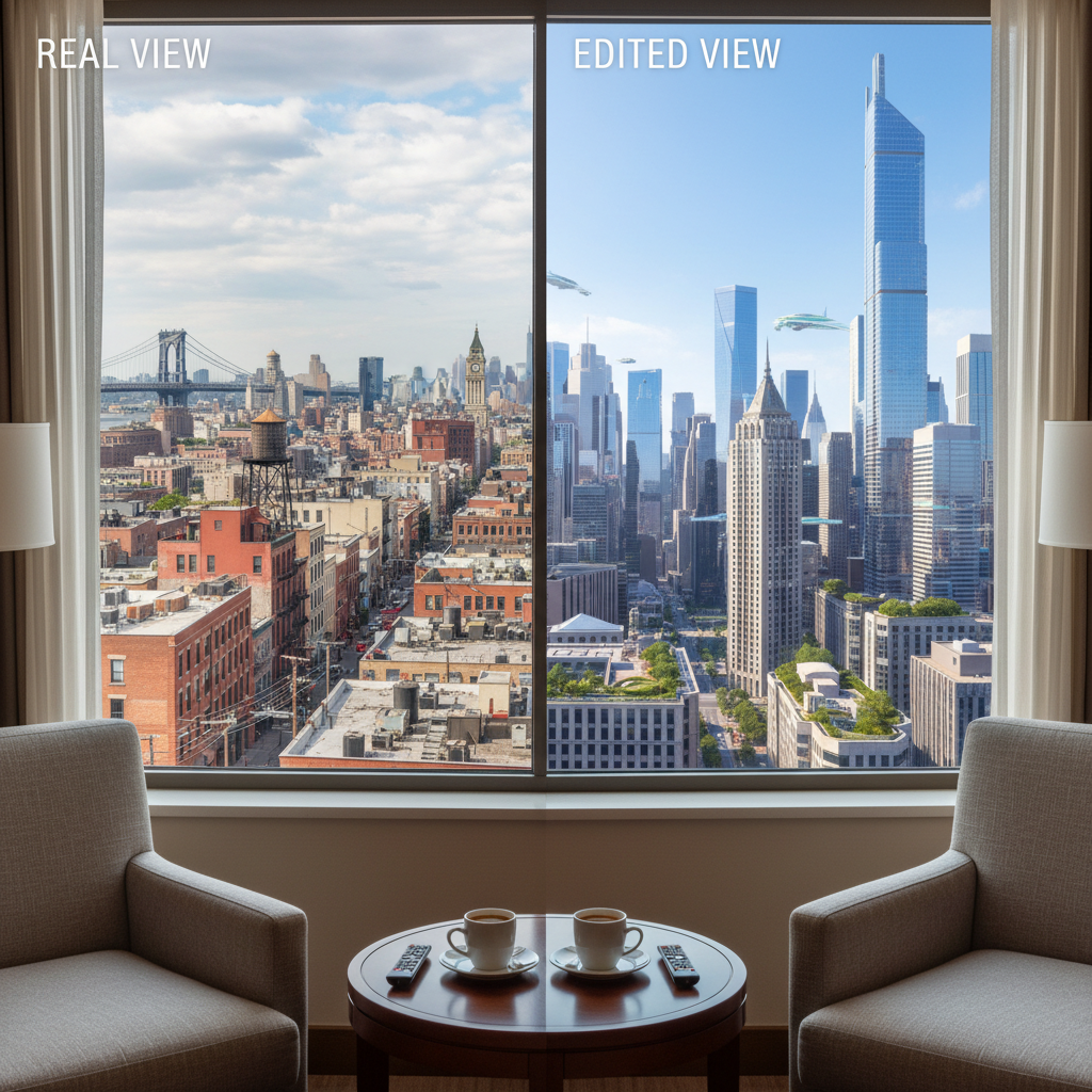 Split-image showing a doctored vs. real hotel window view, highlighting common marketing tricks