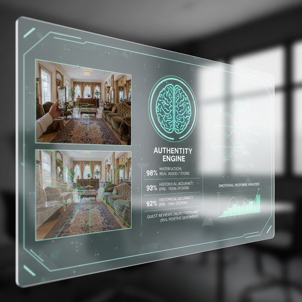 Alt text: AI analyzing virtual hotel tour for authenticity to prevent manipulation