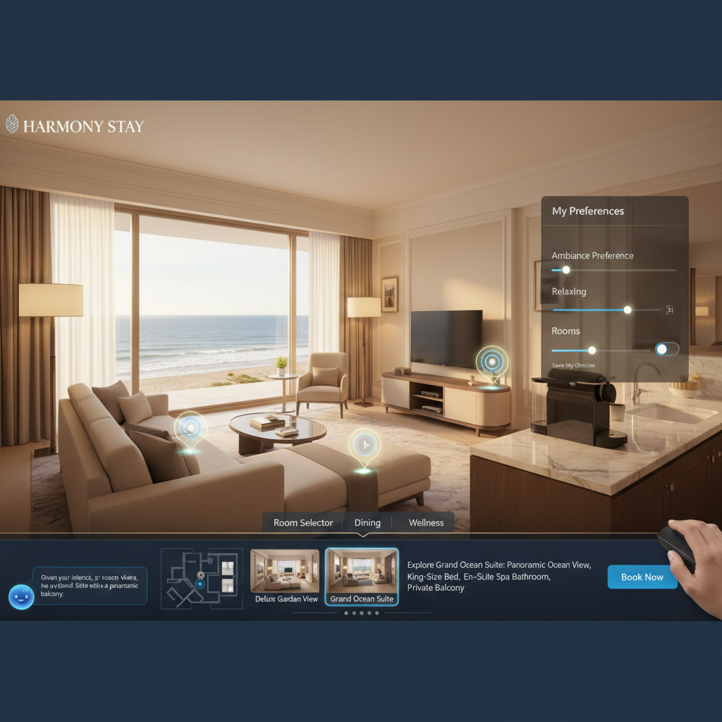 Example: “Our hotel’s 360 tour lets you virtually walk from lobby to pool, while our AI-driven interface suggests rooms based on your profile.”
